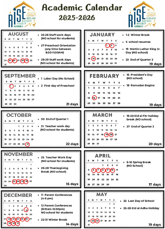 Our academic calendar highlights important school dates, holidays, and instructional milestones for the 2025–2026 school year.